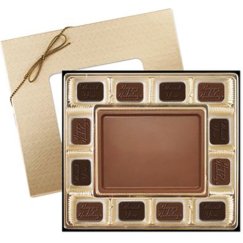 Small custom chocolate delights gift box. 12 themed chocolate pieces surrounding a creamy milk or dark chocolate centerpiece. Select up to 2 themed chocolate pieces in milk and dark chocolate.
