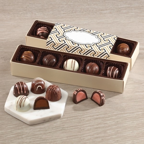 These sleek boxes are filled with an enormous taste sensation! Each box includes 5 creamy truffles in an assortment of flavors, and is complete with your choice of sleeve: zigzag, weave, or your own custom full-color art. Imprint color options are Black,Gold,Silver,Blue,Green,Red.