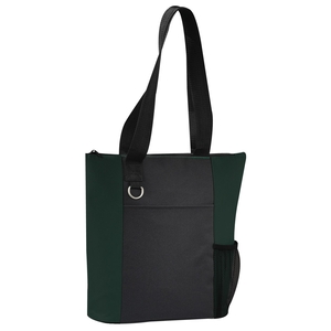 The Infinity Convention Tote has a zippered main compartment with a 11.5" handle drop. It additionally features an open front pocket key ring and a side mesh pocket. Bottom piping has been removed.