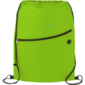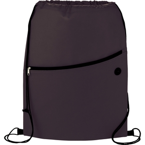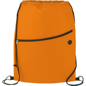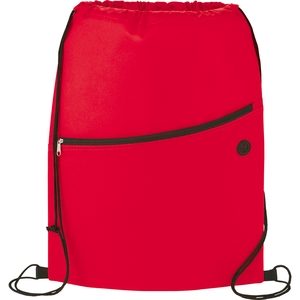 The Sidekick Non-Woven Drawstring Bag has an open main compartment with cinching rope closure. It also features a zippered front pocket with a handy earbud port and reinforced corner tabs.